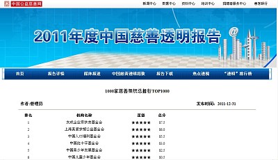 2011年12月29日,民政部“中民慈善捐助信息中心”在北京發(fā)布《中國(guó)慈善透明報(bào)告(2011)》。友成基金會(huì)在全國(guó)受測(cè)評(píng)的1000家公益組織中總分第一,位居全國(guó)公益組織2011透明度排行榜榜首。