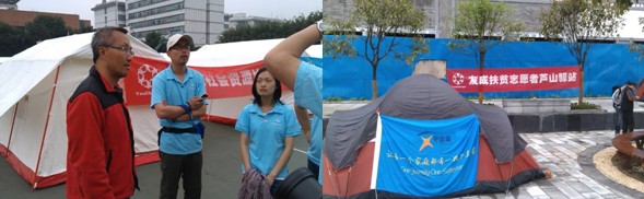 4月24日,友成-NGO備災(zāi)中心蘆山行動組進(jìn)入距離蘆山縣城15公里的龍門鄉(xiāng)古城村山組進(jìn)行災(zāi)情評估,并完成了志愿者驛站的帳篷搭建和垃圾清理。目前計(jì)有18名志愿者在驛站負(fù)責(zé)救災(zāi)物資的接收和分發(fā)。