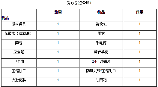 【特別聲明:愛心包中原計劃的“防風(fēng)火柴”不能通過航空運輸,故統(tǒng)一調(diào)換為壓縮毛巾】