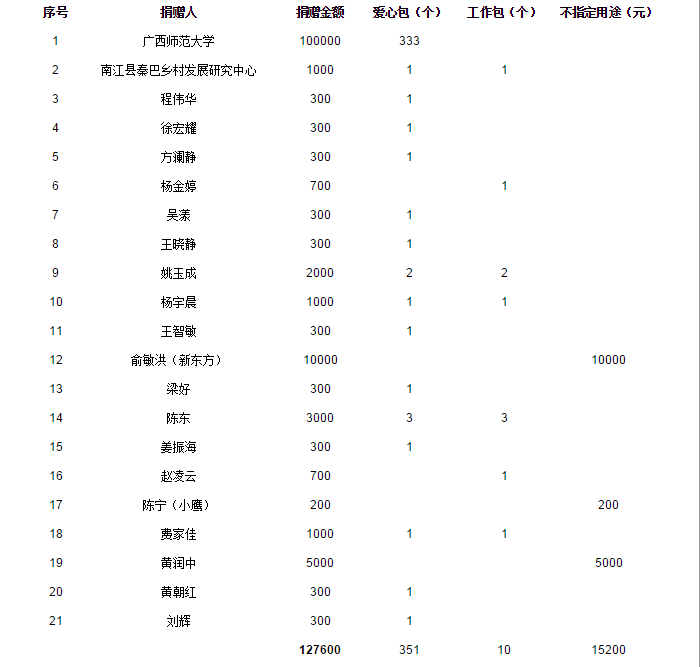 截至8月6日19:00,共有49位個人及4家企業(yè)、社會組織共認(rèn)捐資金1,145,901.00元,目前已到賬127,600元。其中共認(rèn)捐家庭愛心包2132個,工作包265個,工作站5個,未指定用途款項20200元整。
