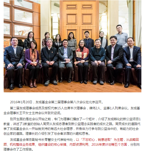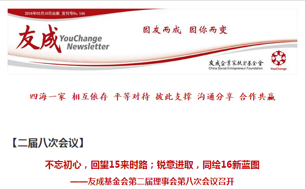 Newsletter第144期:不忘初心,回望15來時(shí)路;銳意進(jìn)取,同繪16新藍(lán)圖 ——友成基金會(huì)第二屆理事會(huì)第八次會(huì)議專題