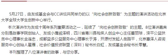Newsletter第166期:【友成專題】友成攜手CC講壇舉辦“向社會(huì)創(chuàng)新致敬”專場(chǎng)演講視頻分享!