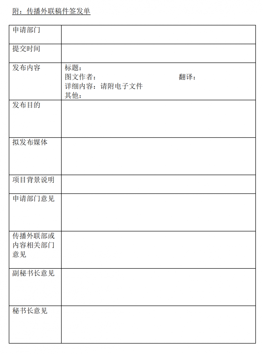 (二)部門主任初審:所有需向外發(fā)布的稿件需由稿件發(fā)起部門填報(bào)稿件簽發(fā)單,按初審-預(yù)審-終審-簽發(fā)流程審定相關(guān)內(nèi)容后予以發(fā)布;包括:核定發(fā)布內(nèi)容與事實(shí)無(wú)誤、發(fā)布媒體建議;稿件簽發(fā)單與發(fā)稿內(nèi)容電子文件一起報(bào)送傳播外聯(lián)部;