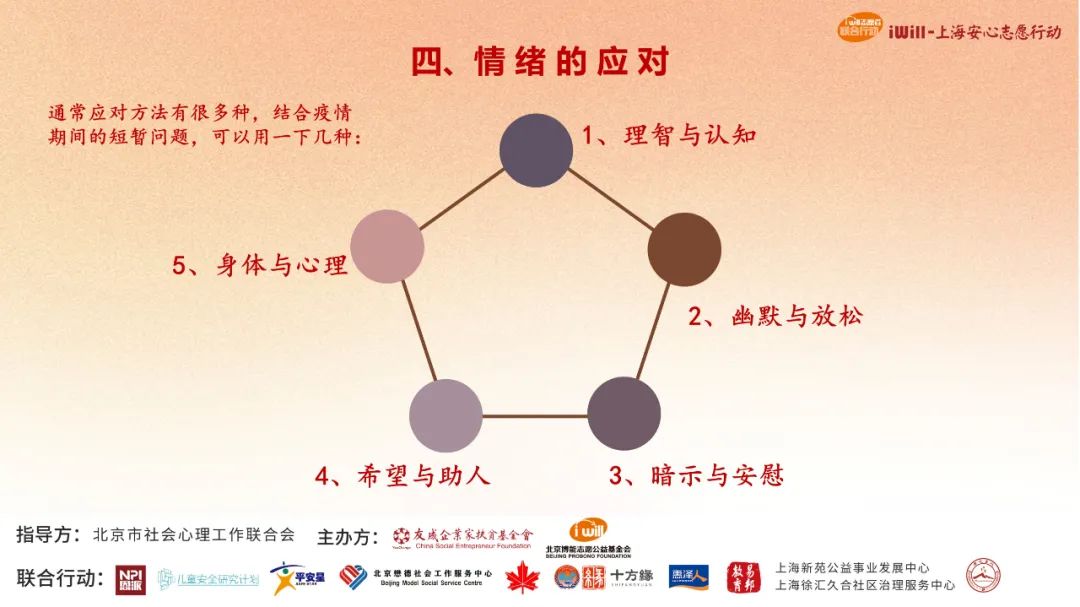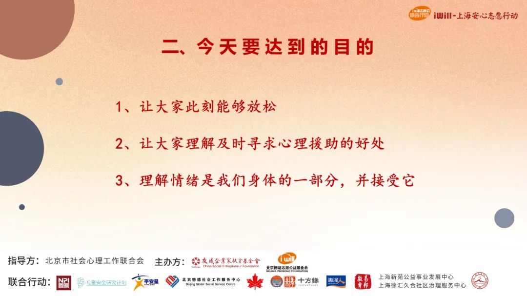本次公開課從“幫助你認(rèn)知情緒”入手,以心理學(xué)專業(yè)知識(shí)為大家打下了一個(gè)對(duì)情緒的認(rèn)知基礎(chǔ),而正如柳建軍教授所言,接下來如何正確的、有效的調(diào)節(jié)情緒,保持心境的平和安穩(wěn),是有很多辦法和技巧的。iWill上海安心行動(dòng)還將繼續(xù)安排國(guó)內(nèi)優(yōu)秀的心理專家,通過公開課和一對(duì)一與專家溝通等途徑,為上海同胞和全國(guó)有需要的同胞們持續(xù)提供“安心”的力量。