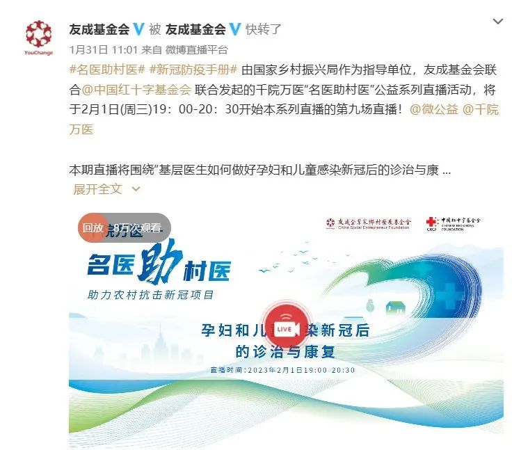 農(nóng)村地區(qū)既是疫情防控的重點環(huán)節(jié)又是薄弱環(huán)節(jié)。2023年元旦到春節(jié)期間,在國家鄉(xiāng)村振興局指導(dǎo)下,友成企業(yè)家鄉(xiāng)村發(fā)展基金會(下稱“友成基金會”)積極開展“名醫(yī)助村醫(yī)”公益項目,通過防疫知識直播、物資捐贈、線上咨詢等方式,助力農(nóng)村地區(qū)抗擊新冠疫情,守護廣大農(nóng)民群眾生命健康。