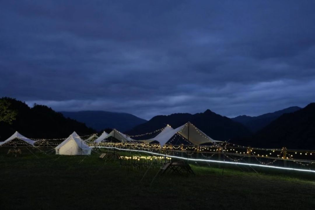 熱鬧的馬海夜宴后,嘉賓、游客們在馬海村中寨的露營空地上閑坐談天、欣賞風(fēng)景,遠處綿延的綠色梯田、暗藍色天空和暖黃色的燈光交相輝映。據(jù)悉,這片已經(jīng)搭建好帳篷、天幕和桌椅的營地計劃在未來打造特色露營業(yè)態(tài),為前來馬海旅游的游客提供與眾不同的梯田露營體驗,也將為馬海村旅游消費和就業(yè)發(fā)展提供機會和動力。露營地一旁被五彩燈光照亮的場地,則正是本次音樂會的原生態(tài)“下沉式舞臺”。從遠處望去,這片明亮的區(qū)域就像一顆啟明星,預(yù)示著馬海村正在向著更美好的明天奔去。