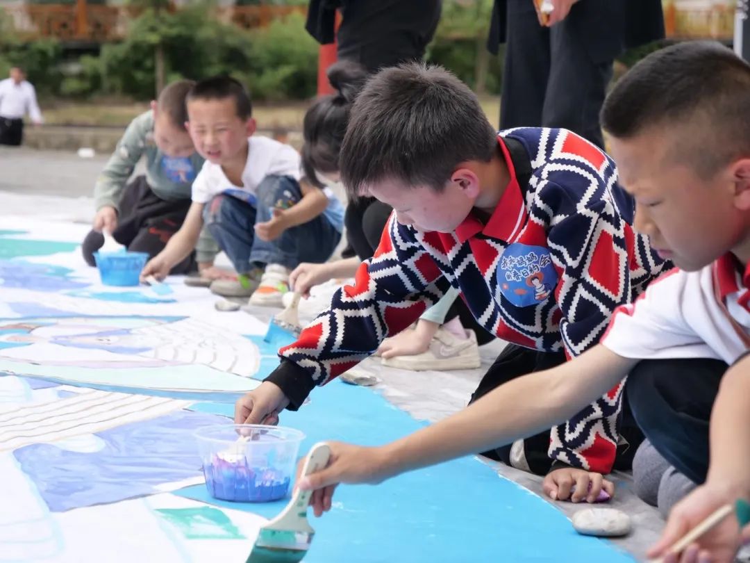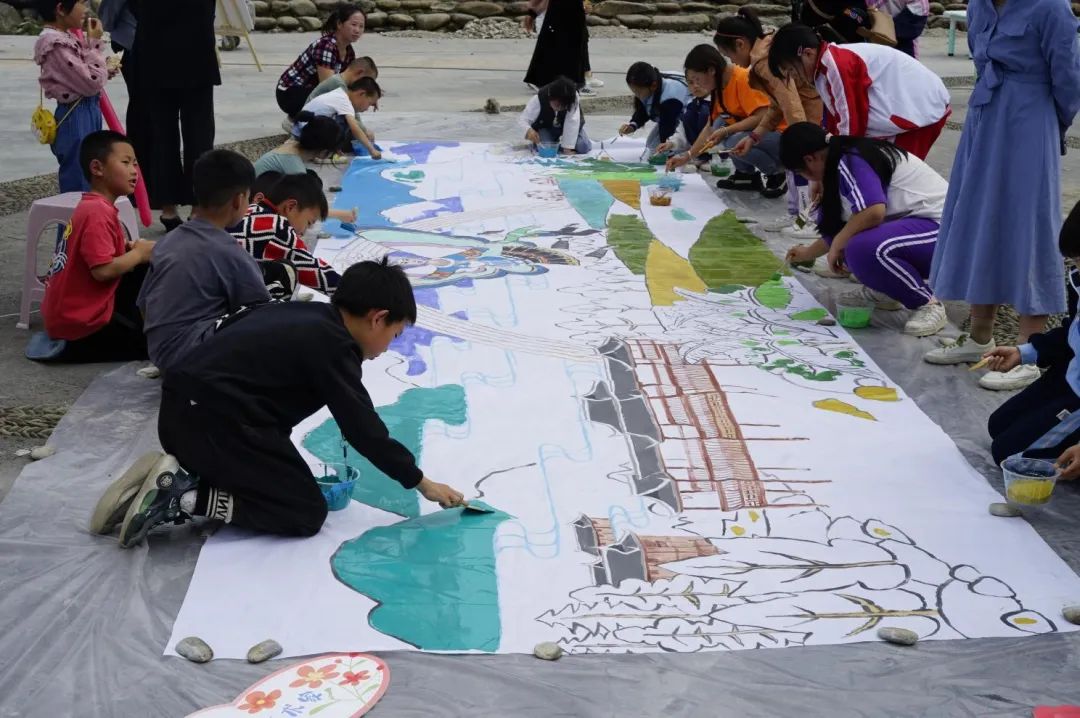 小朋友們一起協(xié)作,共同繪制家鄉(xiāng)好風(fēng)光,盡現(xiàn)雷山之美