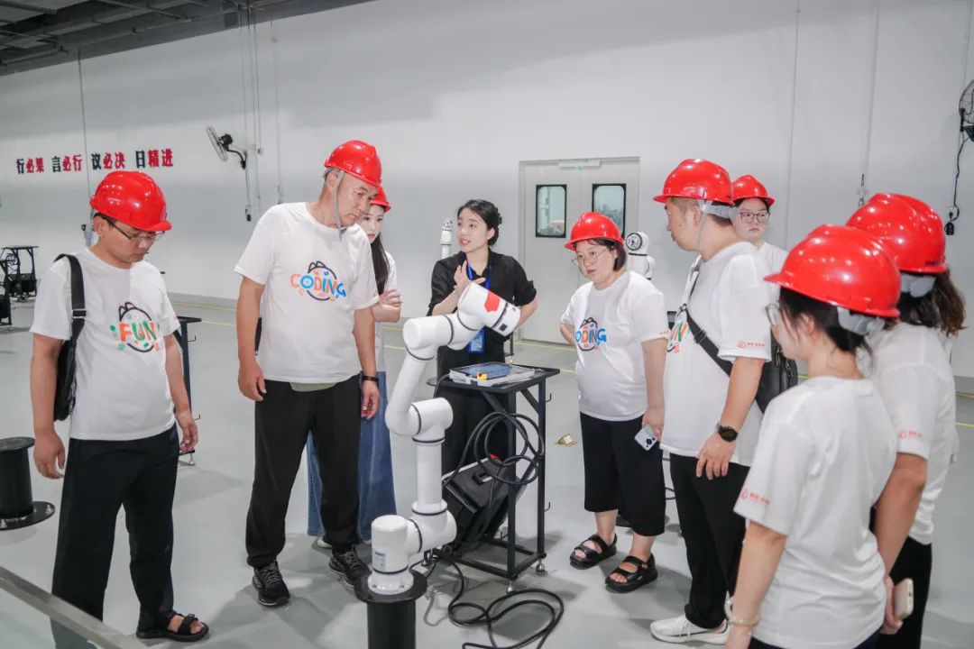 老師們還戴上安全帽,通過平板直觀地控制協(xié)作機(jī)器人,體驗(yàn)編程邏輯在物理世界的實(shí)時(shí)映射。這些沉浸式體驗(yàn),成功地將講座中的抽象原理具象化,變得觸手可及且生動(dòng)深刻。