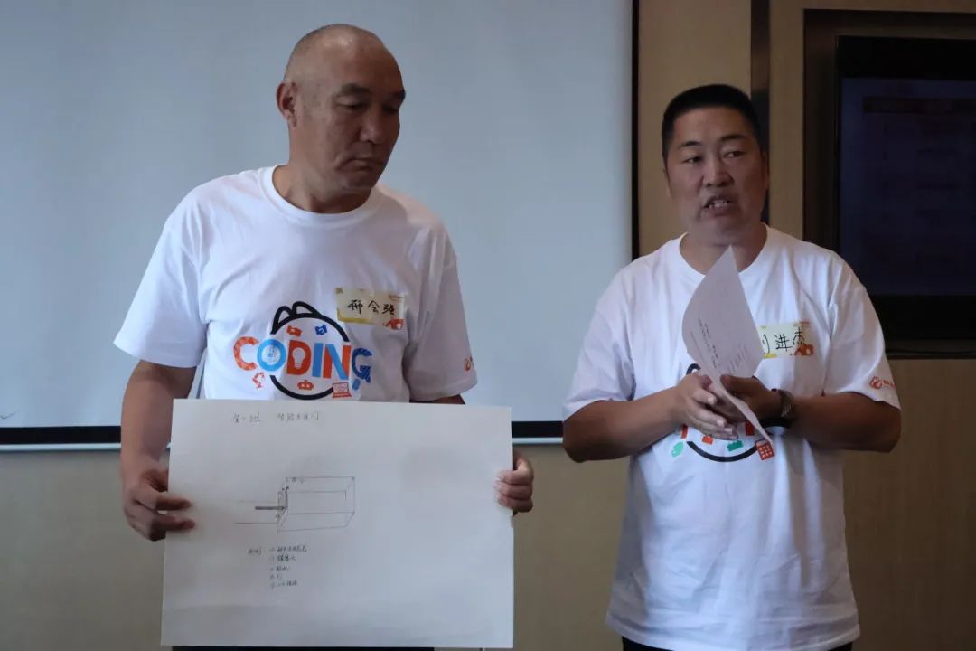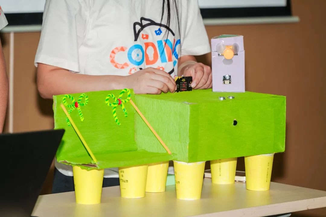 隨后,王老師以“智能垃圾桶”為任務(wù)點(diǎn)燃實(shí)戰(zhàn):老師們從一開始的簡(jiǎn)易紙盒外觀,到后面“卷”彩紙外包裝、“卷”垃圾桶形狀,再到垃圾桶功能的層層加碼,儼然已忘了這只是進(jìn)階營(yíng)第一天的入門小作業(yè),而是自發(fā)地加班完善自己小組的作品。