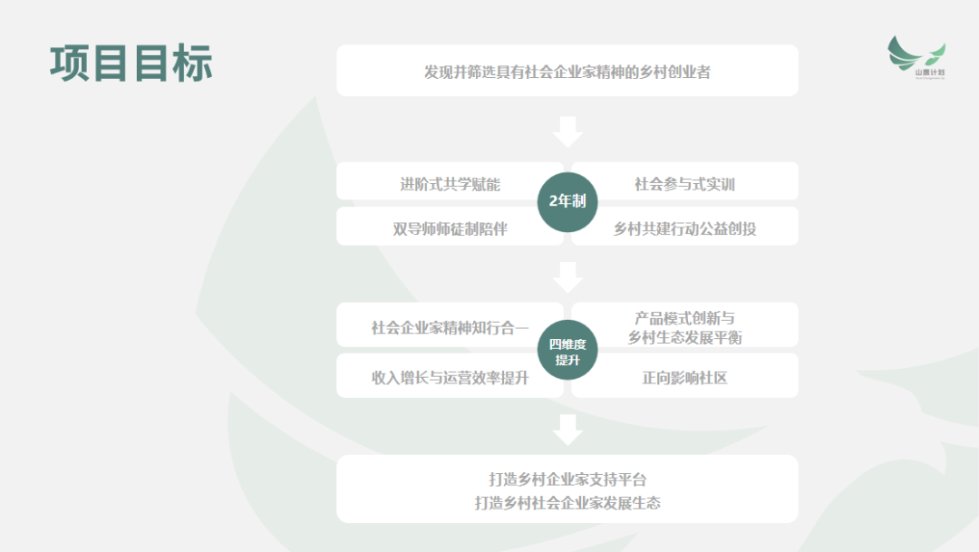 項(xiàng)目通過(guò)兩年期鄉(xiāng)土商業(yè)課程共學(xué)賦能+在地探索專(zhuān)題工作坊+導(dǎo)師師徒制陪伴+鄉(xiāng)村社會(huì)創(chuàng)新項(xiàng)目孵化及小額創(chuàng)投的模式,讓山鷹們實(shí)現(xiàn)“社會(huì)企業(yè)家精神知行合一”“收入增長(zhǎng)與運(yùn)營(yíng)效率提升”“產(chǎn)業(yè)發(fā)展與鄉(xiāng)村生態(tài)發(fā)展平衡”“正向影響鄉(xiāng)村社區(qū)”四維度的提升。同時(shí)鏈接資源網(wǎng)絡(luò),搭建起鄉(xiāng)村社會(huì)企業(yè)家支持平臺(tái),打造鄉(xiāng)村社會(huì)企業(yè)家發(fā)展生態(tài)。
