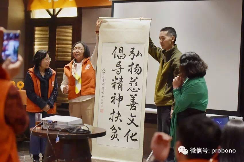 “彭艷女士正是讓我看到了這種精神,她是北京惠澤人公益發(fā)展中心理事、環(huán)境保護(hù)與社會(huì)發(fā)展獨(dú)立咨詢(xún)專(zhuān)家,但是每次的公益活動(dòng),我都能在現(xiàn)場(chǎng)看到她的身影以及她有條不紊的安排,彭艷女士讓我感受到了專(zhuān)業(yè)志愿者對(duì)于NGO的力量,所以我以個(gè)人身份加入了博能,同時(shí)也代表友成基金會(huì)為博能提供資金支持”。王平女士還特別邀請(qǐng)了友成基金會(huì)環(huán)境顧問(wèn)羅齊家先生到場(chǎng)分享他的慈善之路并主持了羅先生向博能基金會(huì)贈(zèng)送一副墨寶的儀式。 她相信并希望博能成為成就“精神扶貧為主、物質(zhì)扶貧為輔”的典范。