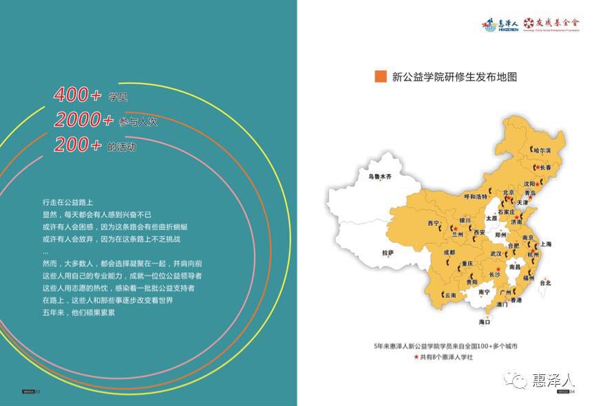時間軸來到2011年,惠澤人提出一個理念——一個機(jī)構(gòu)(團(tuán)隊)能夠走多遠(yuǎn),是由它的領(lǐng)導(dǎo)人的眼界與能力直接決定的。于是,如何提升公益機(jī)構(gòu)“領(lǐng)導(dǎo)力”,為公益行業(yè)培養(yǎng)優(yōu)秀的領(lǐng)導(dǎo)力人才,成了惠澤人首要解決的任務(wù)。這一理念與友成基金會的“3A3力”不謀而合,得到了友成基金會的大力支持?;轁扇诵鹿鎸W(xué)院應(yīng)運(yùn)而生。2012年的初次試水,2013年的持續(xù)完善,到2014.2015的井噴式綻放!新公益學(xué)院持續(xù)培養(yǎng)了數(shù)百名優(yōu)秀的NGO及企業(yè)CSR人才。去年,惠澤人深度挖掘平臺型社會組織,取得了豐碩成果。