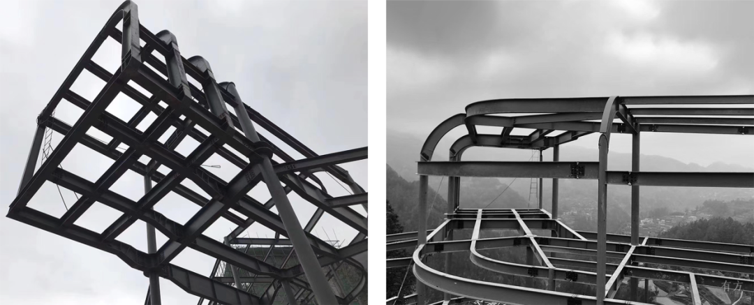 考慮到山地以及曲面施工的復(fù)雜性,建筑主體采用鋼結(jié)構(gòu)體系,外部包裹金屬鋁板,內(nèi)部與室內(nèi)界面留出空腔填充輕質(zhì)保溫及防水材料。它們整體在工廠加工完成,并在現(xiàn)場完成吊裝,建造簡易迅速,運(yùn)輸方便安全。這樣的選擇,也充分應(yīng)對(duì)了鄉(xiāng)村現(xiàn)場施工的精度不足,以及山地施工的復(fù)雜條件帶來的挑戰(zhàn)。