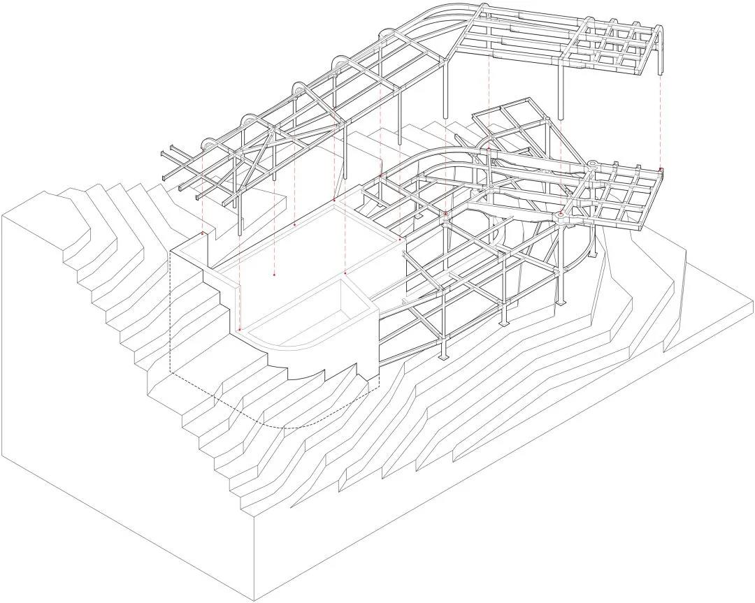 交錯(cuò)咬合的“L”形體量獲得了最大化的景觀活動(dòng)面,分別形成了兩個(gè)不同高差的室外景觀露臺(tái)。上層屋面可登高望遠(yuǎn),一覽村落與人文與自然美景,下層屋面也結(jié)合使用功能,形成室外景觀劇場和無邊泳池。