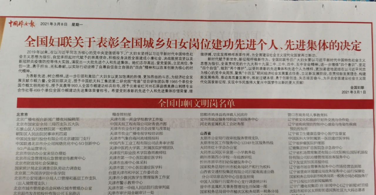 “全國巾幗文明崗”是全國婦聯(lián)為表彰為國家、為社會、為人民做出突出貢獻,取得優(yōu)異成績的優(yōu)秀婦女團體而頒發(fā)的榮譽稱號。2021年度的“全國巾幗文明崗”由包括全國婦聯(lián)、中宣部等25家單位的全國婦女“巾幗建功”活動領(lǐng)導(dǎo)小組評選確定,共表彰1985個“全國巾幗文明崗”。