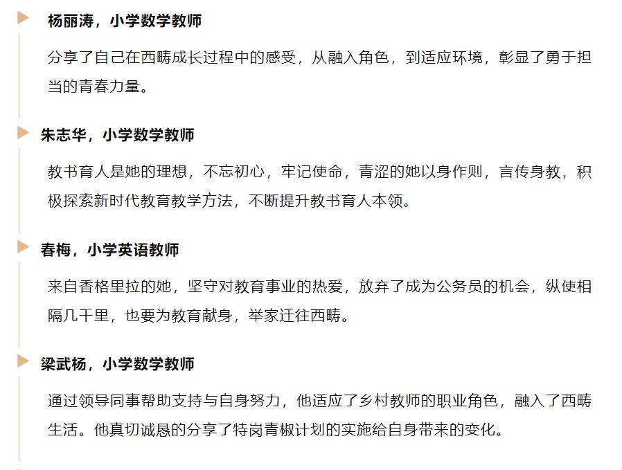 在座的特崗教師分別就我為什么選擇特崗這一職業(yè)、教學(xué)過程中遇到的問題、未來規(guī)劃、參與特崗青椒計劃的收獲及建議暢所欲言。特崗教師普遍情況是所教非所學(xué),雖然面臨一些困境,但他們正在發(fā)揮苦干實干的務(wù)實品質(zhì)、用敢為人先的拼搏精神,為鄉(xiāng)村教育事業(yè)貢獻(xiàn)青春力量!