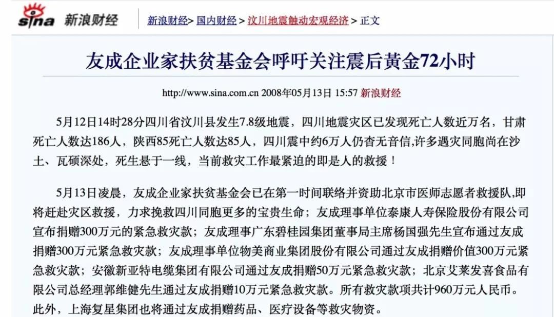 在2008年的汶川地震救援中,友成在“第一時間”的救援行動即體現(xiàn)了災(zāi)區(qū)同胞的“第一需要”:
