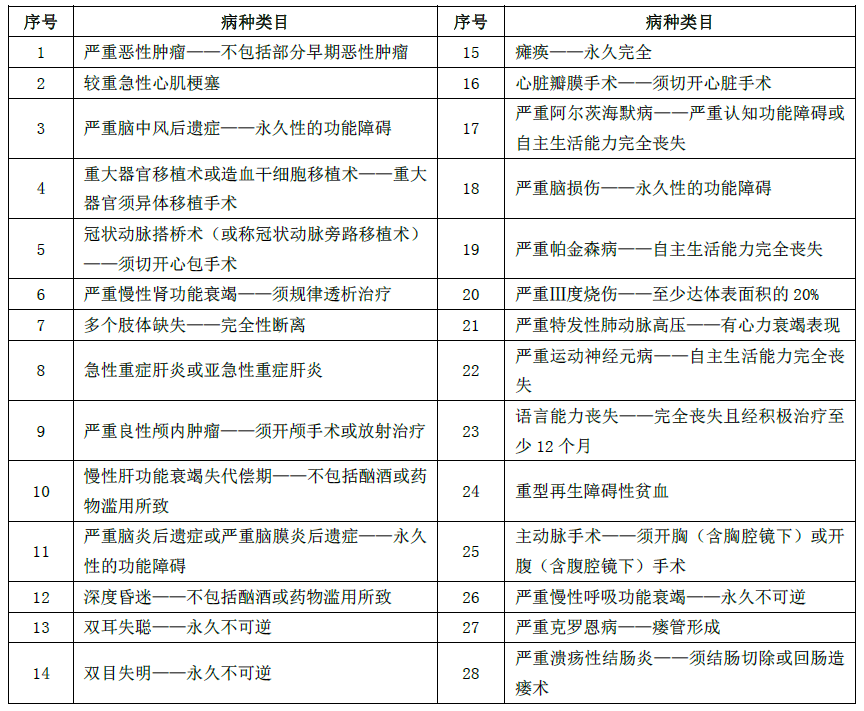 (3)患者所患疾病屬于《重大疾病保險(xiǎn)的疾病定義使用規(guī)范修訂版(公開征求意見稿)》中列明的28類重度疾病。