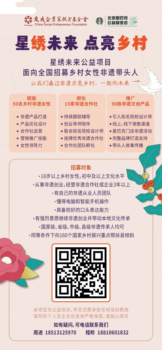“星繡未來(lái)”鄉(xiāng)村女性經(jīng)濟(jì)賦能與非遺傳承項(xiàng)目,由北京星巴克公益基金會(huì)向友成企業(yè)家扶貧基金會(huì)定向捐贈(zèng)635萬(wàn)元人民幣支持啟動(dòng)。項(xiàng)目計(jì)劃遴選出50名女性非遺帶頭人,在3年內(nèi)幫扶她們及其合作社共1250位女性開展非遺創(chuàng)業(yè)。項(xiàng)目還將重點(diǎn)支持15支鄉(xiāng)村女性創(chuàng)業(yè)團(tuán)隊(duì),通過(guò)賦能、孵化、推廣等方式,助力其就業(yè)、創(chuàng)業(yè),促進(jìn)非遺產(chǎn)業(yè)的可持續(xù)發(fā)展,加速非遺文化的傳播。