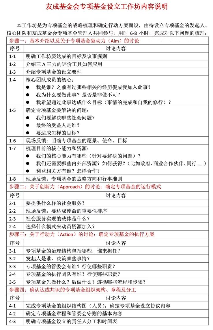 在友成,經常有一些潛在的捐款人有發(fā)起專項基金的請求,這些潛在捐款人除了具有通過公益來實現(xiàn)自己的心愿以外,對將要從事的公益活動的方向也有大概的意愿,但是對于真正做什么、如何做、如何評估項目的社會價值卻一無所知。使用“三A三力”和這些捐款人一起通過工作坊的方式,就可以幫助專項基金的發(fā)起人,梳理出一個非常清晰的、既具有整體性又具有細節(jié)性的解決方案,即戰(zhàn)略。