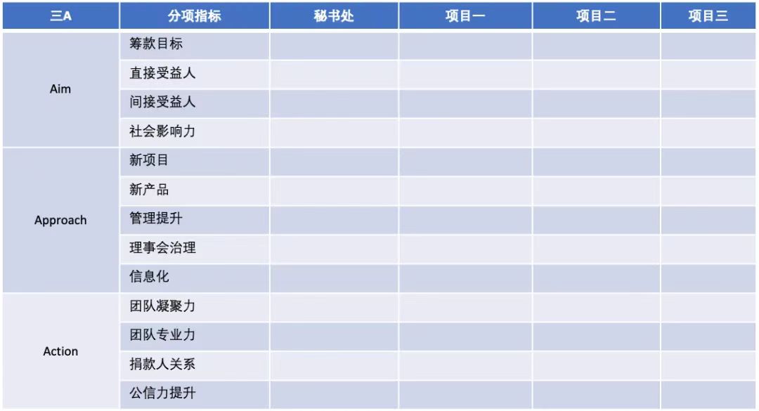 “三A三力”因其“目標-方法-行動”有機構成的框架和邏輯,天然可以成為績效考核的工具。友成基金會每年的年終述職考核,用的就是這樣一個框架,每個員工在述職結束后,全體員工從三A的維度給予打分,這也是另一種意義上的360度考核。