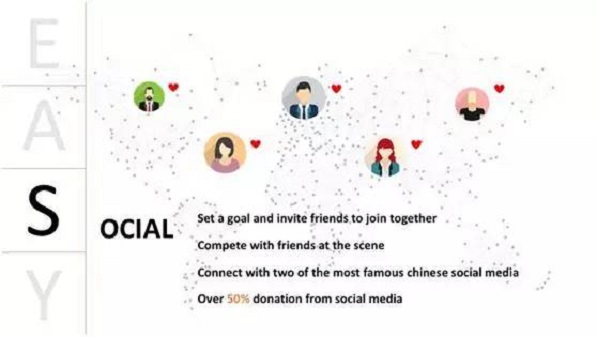 “S”是“social”,我們認為小額捐款人的本質(zhì)是一種社交,小額捐款人特別愿意和他們的朋友來進行分享。我們已經(jīng)接通了中國最大的社交媒體微信、微博,在上面有很多基于公益的籌款游戲,比如設定一個目標,讓周圍的朋友幫助我們達成籌款目標。同時,也可以和朋友發(fā)起籌款比賽,看誰在一個時間段籌的錢多等等。實際上,我們有超過50%的錢來自于這種社交型的籌款游戲。