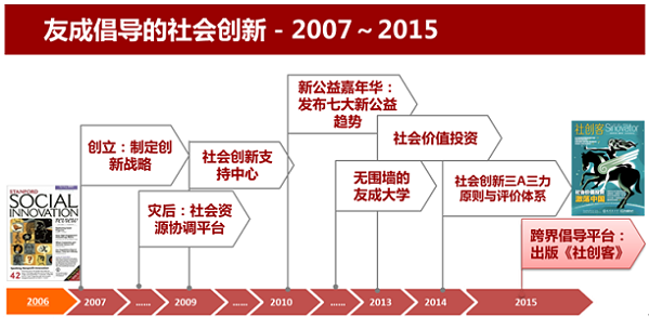 友成基金會(huì)(China Social Entrepreneur Foundation)2007年成立,可以說(shuō)我們是為“社會(huì)創(chuàng)新”這一使命而生的,我們的愿景、定位、使命和價(jià)值觀,都貫穿著對(duì)社會(huì)創(chuàng)新的理解和認(rèn)識(shí)。友成致力于成為“探索社會(huì)創(chuàng)新之路,成為推動(dòng)人類社會(huì)更公平、更有效率、更可持續(xù)發(fā)展的重要力量”。在這一愿景下,八年來(lái)我們是如何創(chuàng)導(dǎo)和推動(dòng)社會(huì)創(chuàng)新的?上圖是我們的一些里程碑事件。