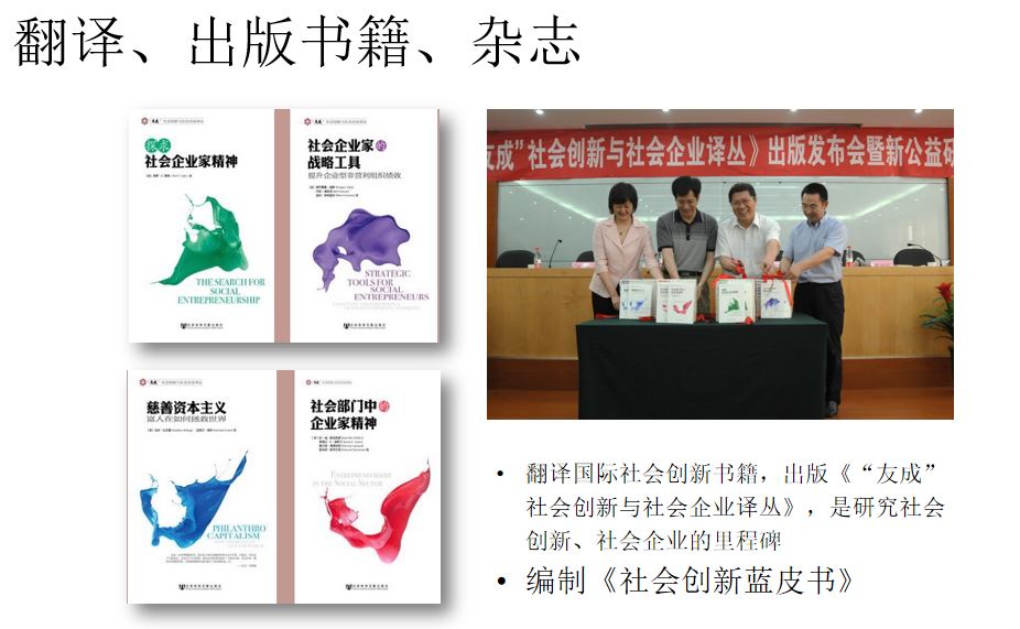 十四年來,友成基金會一直用各種方式倡導社會創(chuàng)新。我們在“社會創(chuàng)新”的主題下,翻譯或自己編寫出版了一些非常有價值的書籍:友成組織翻譯出版的《社會創(chuàng)新與社會企業(yè)譯叢》,被業(yè)界認為是國內(nèi)研究社會創(chuàng)新、社會企業(yè)的里程碑;友成編寫出版的《社會創(chuàng)新藍皮書》也廣受業(yè)內(nèi)外歡迎。