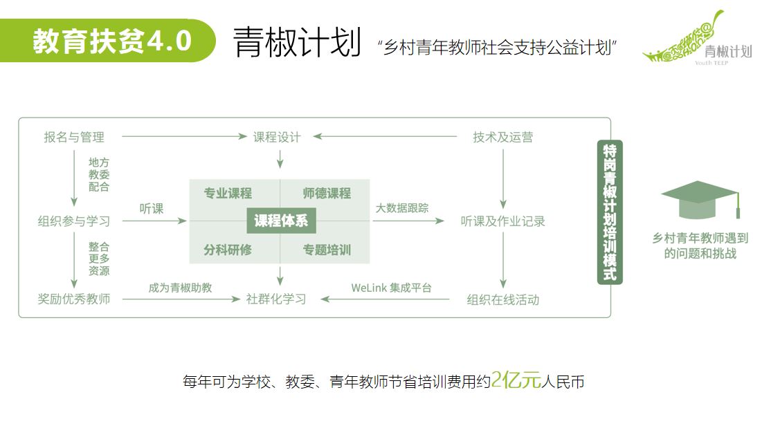 在鄉(xiāng)村教育領(lǐng)域,友成在不斷的探索。“雙師教學”之后,我們又啟動了新的教育扶貧項目叫“青椒計劃”,全稱是“鄉(xiāng)村青年教師社會支持公益計劃”,主要針對鄉(xiāng)村的青年教師,大規(guī)模地把最先進的教學理念、最先進的教學方法和最先進的教學資源,通過線上培訓,送達全國各地的鄉(xiāng)村青年教師。到目前為止,我們已經(jīng)在全國培訓了80000多鄉(xiāng)村教師。“青椒計劃”為他們提供整整一年的培訓,每個星期都有課,我們請北師大、華東師大最好的老師給他們培訓,大大提升了對鄉(xiāng)村青年教師教學技能和教學水平。“青椒計劃”培訓的這80000多名老師在去年的停課不停學階段,在鄉(xiāng)村學校起到骨干的作用。