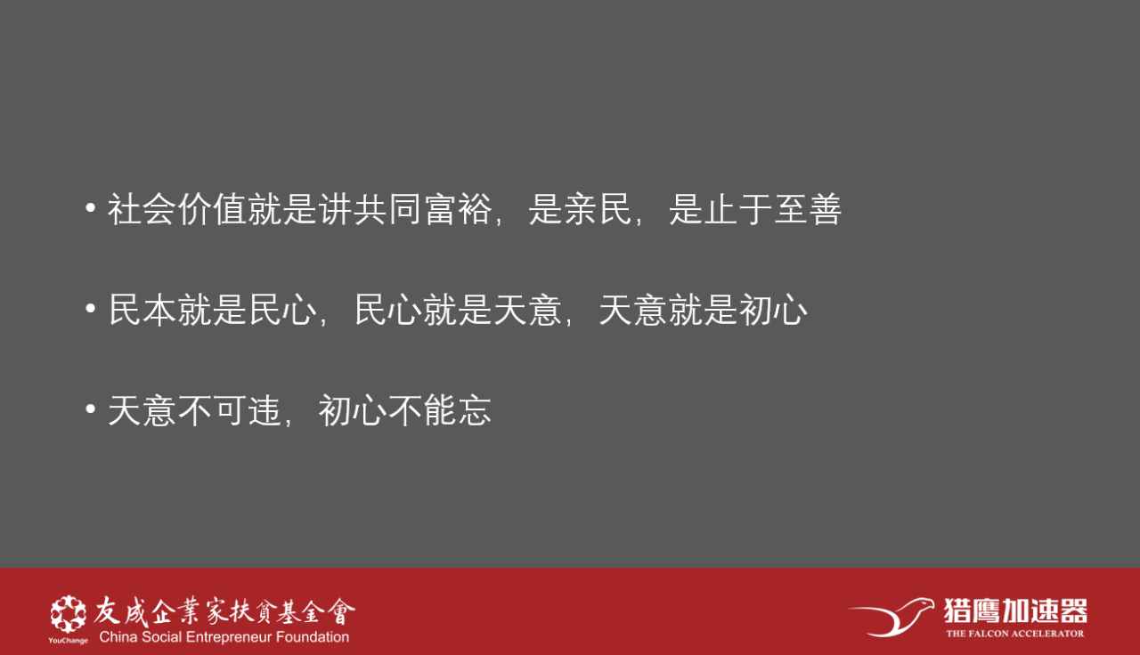 分享這個研究一方面是為了說明一個好的社會的特點(diǎn),同時也是為了說明獵鷹加速器的意義,那就是發(fā)現(xiàn)并支持具備這樣的領(lǐng)導(dǎo)力的社會企業(yè)家。