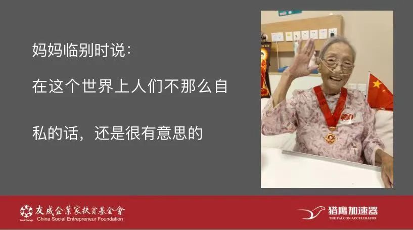 不忘初心不僅是社會企業(yè)家所必需具備的品質(zhì),也關(guān)系到每一個人的生命質(zhì)量。因?yàn)樯鼇碜杂趷?,也回歸于愛。人在臨命終時,創(chuàng)造力沒有了,行動力沒有了,但是那個愛的初心、真心就會顯露出來。