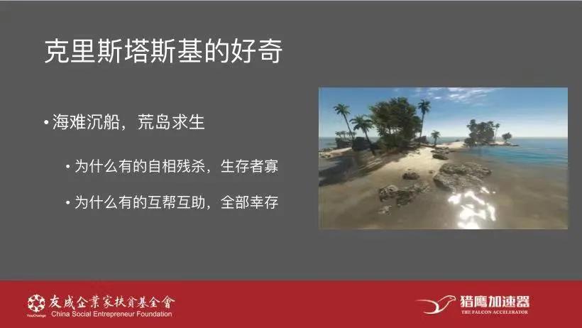 首先,我想和大家分享一個關(guān)于美好社會的研究成果。也許你們都聽說過這項(xiàng)研究。尼古拉斯·克里斯塔基斯來自耶魯大學(xué)社會與自然科學(xué)系,還是最高學(xué)術(shù)等級的斯特靈教授。他對沉船事件充滿了好奇:這么多沉船后海上漂流、流落荒島的事件,為什么有的互幫互助,使得全員都能幸存下來,而有的卻會自相殘殺,只有極少數(shù)人能夠有機(jī)會生存?那些成功做到大部分人幸存而不至于自相殘殺的案例,到底有什么特點(diǎn)?